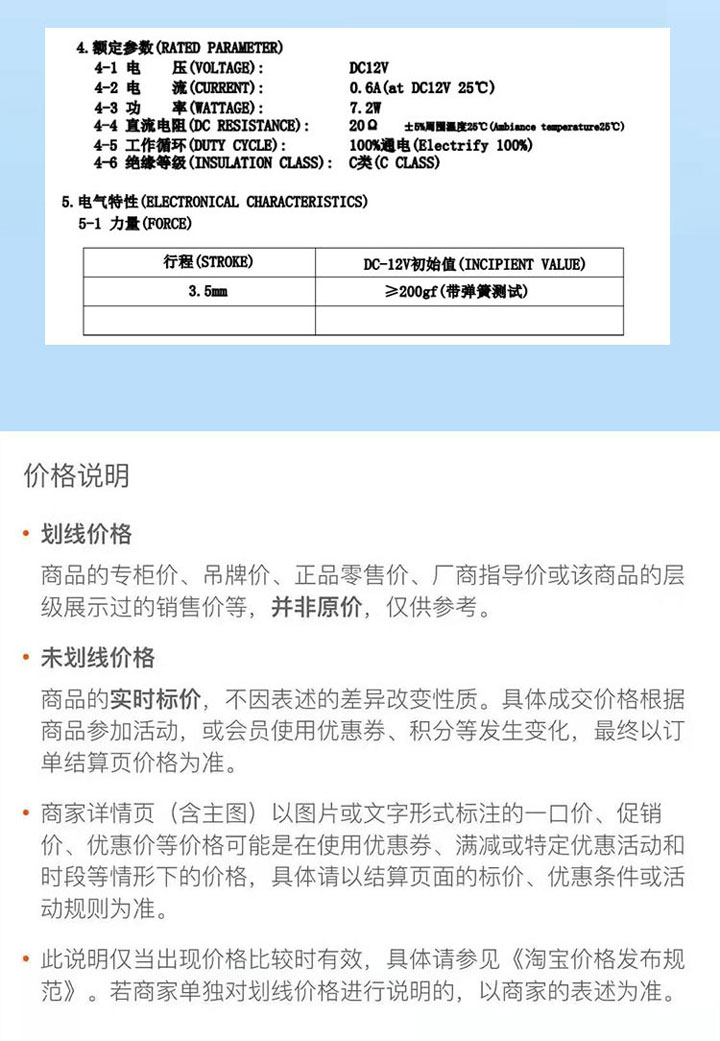 電壓: DC12V 行程: 3.5mm  電阻: 20歐 功率: 7.2W